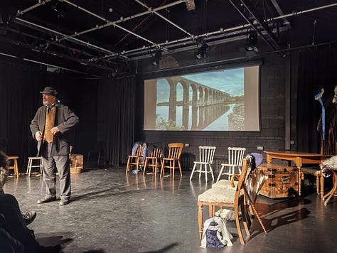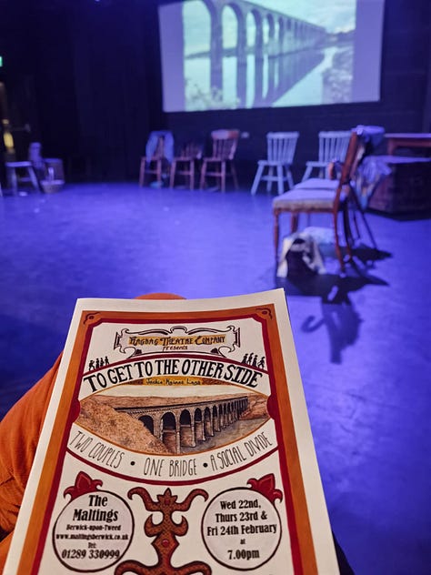 On stage: To Get to the Other Side with the mighty Royal Border Bridge as backdrop (and The Husband strutting his stuff to a packed house (L)). We did finally get a full (and wonderful!) cast together and the show was a sell-out for its three-night run at The Maltings Theatre studio.